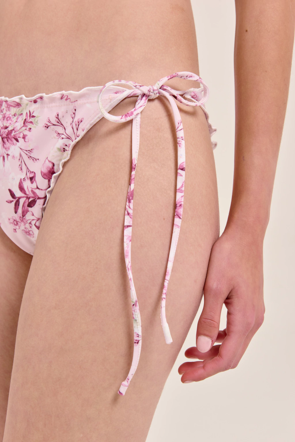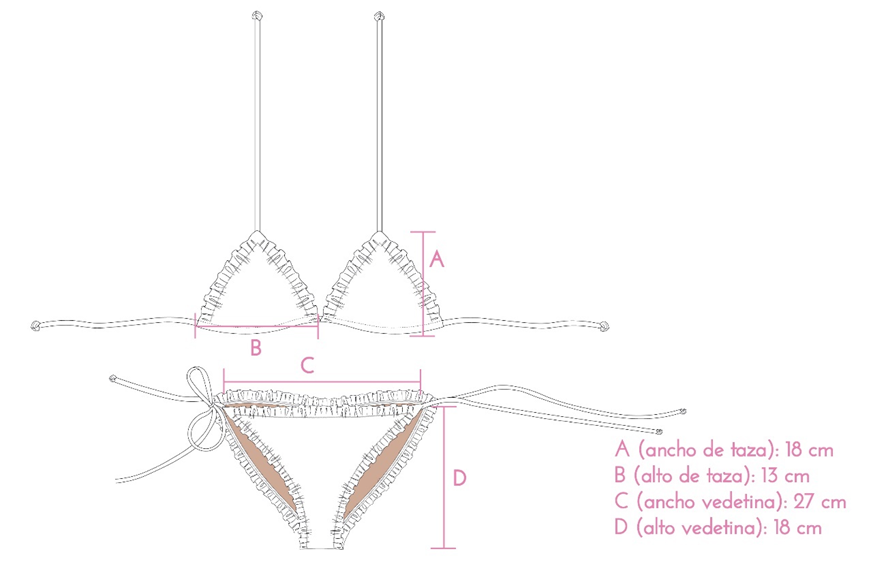 Bikini con estampa floral confeccionado en tricot de elastano. Se destaca por sus voladitos que le dan ese toque romántico y femenino que amamos. Ambas piezas se ajustan con lacitos para que encuentres el calce perfecto. La bombacha es vedetina y tiene frunce en la parte trasera. El corpiño tiene espacio para colocarle tazas.