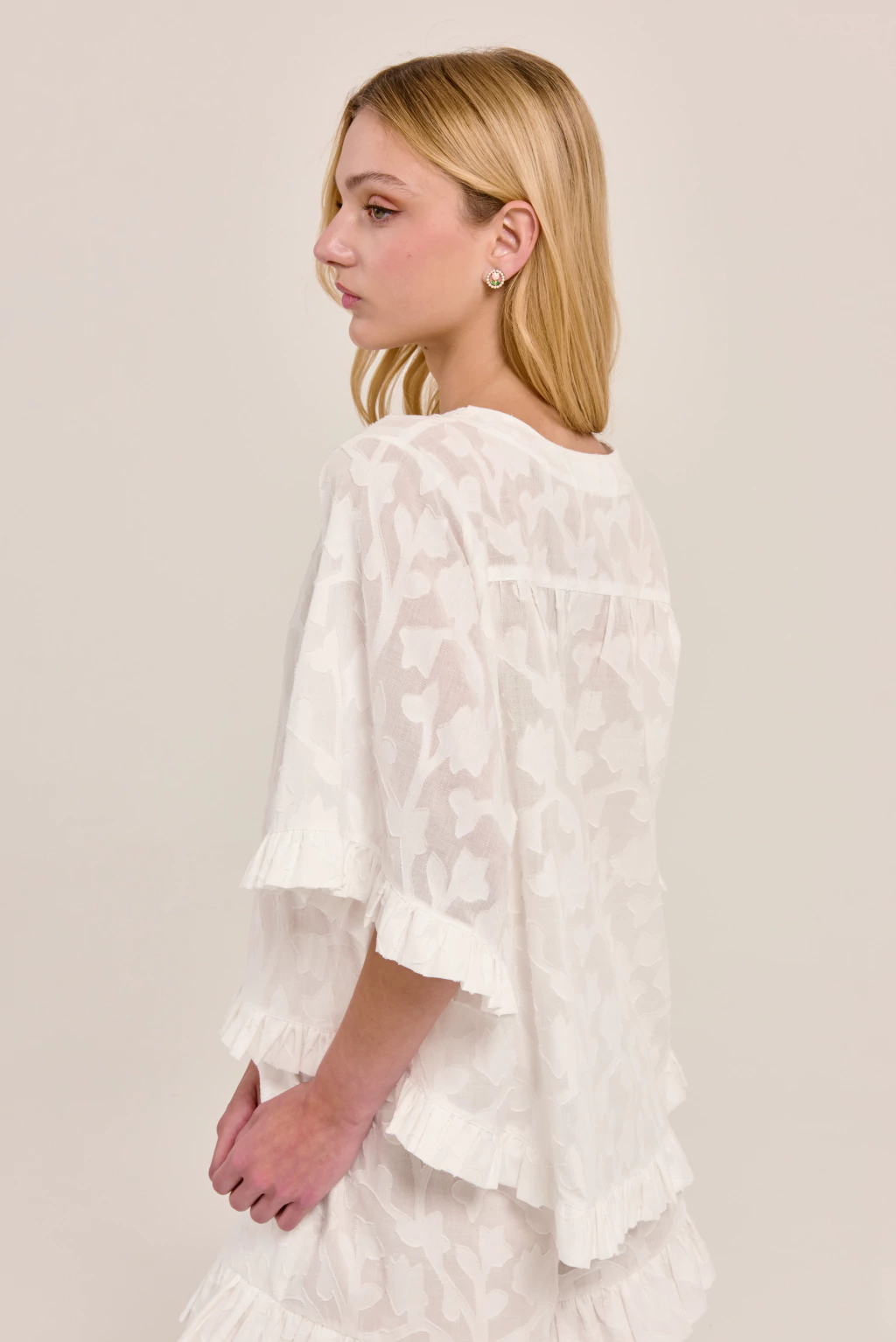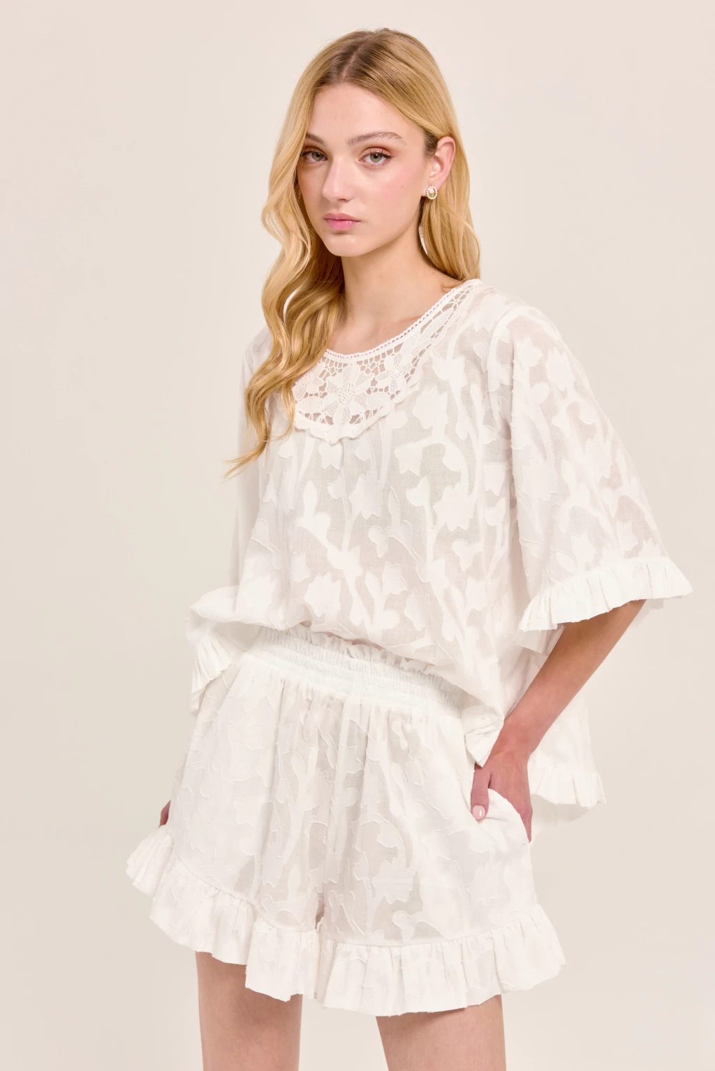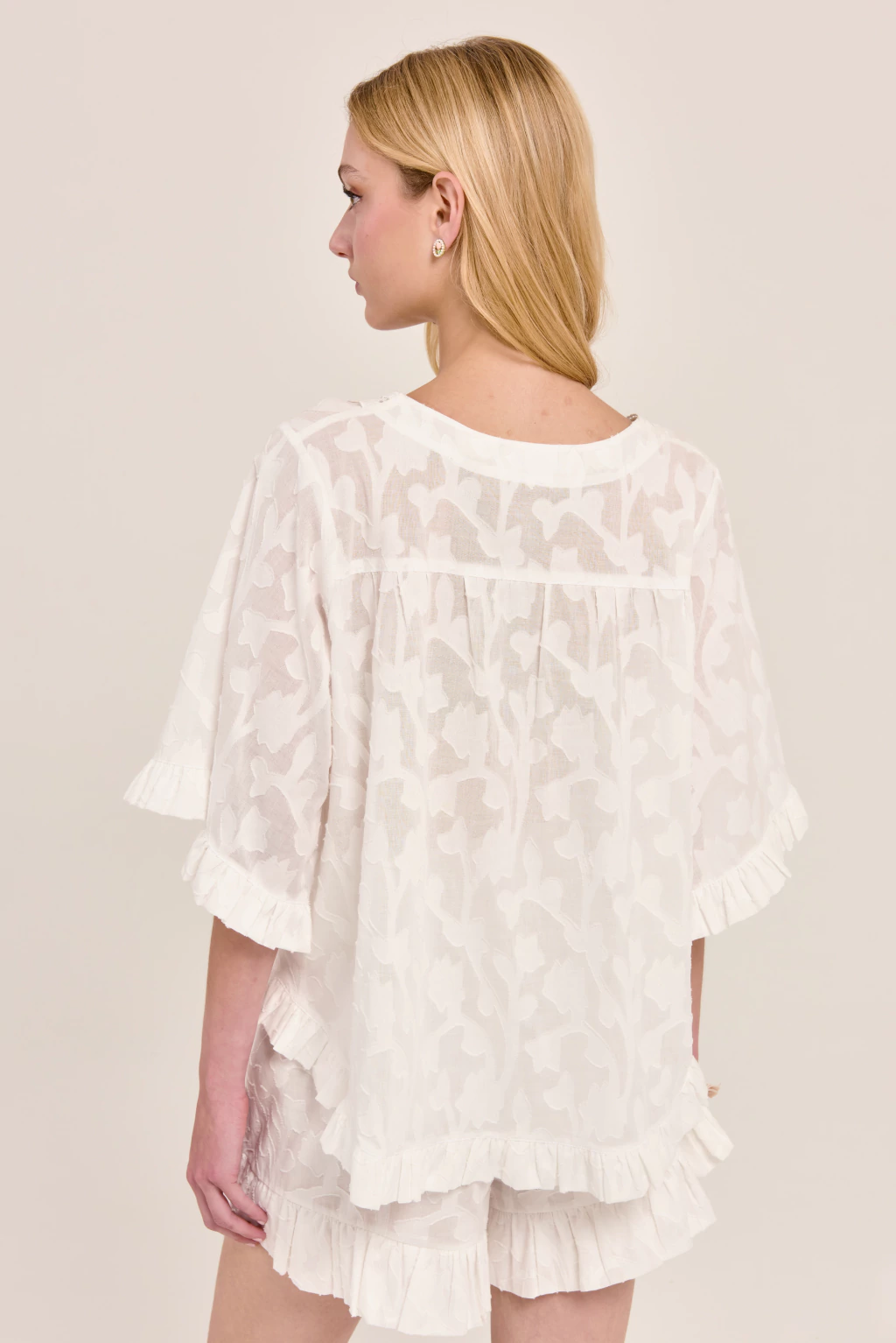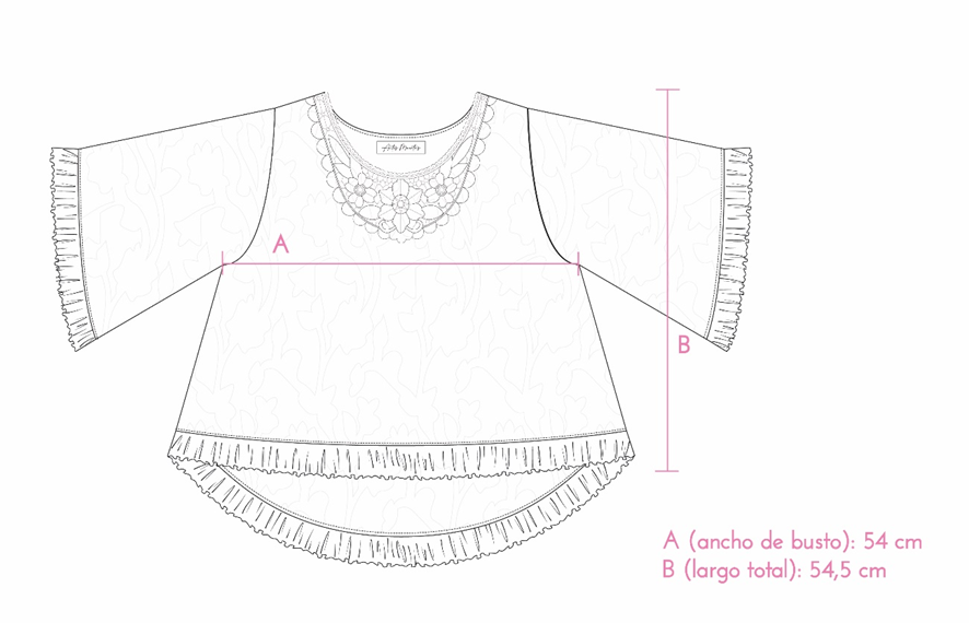 Blusa amplia confeccionada en voile jacquard de algodón, liviano y fresco. Escote redondo con delicado detalle de puntilla y aplique en el cuello, mangas cortas con volado y ruedo con terminación fruncida. Su silueta suelta y femenina la convierte en una prenda romántica y versátil, ideal para usar todos los días.