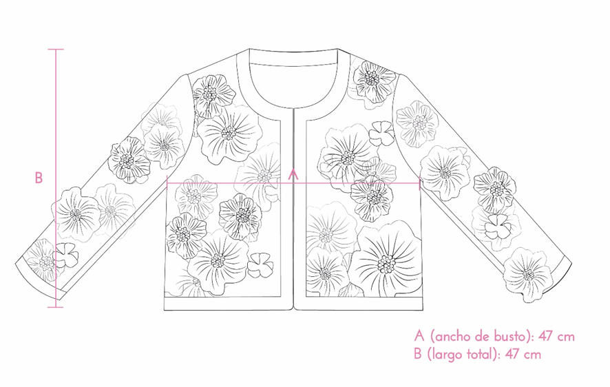 Chaqueta confeccionada en tul bordado con flores y detalles de strass y canutillos. Presenta apliques 3D en forma de flores que le aportan textura y movimiento. De silueta corta, con cierre mediante pequeños ganchitos en el frente y terminaciones cuidadosamente trabajadas en puños, ruedo y escote. Una prenda delicada y sofisticada, ideal para elevar cualquier look.