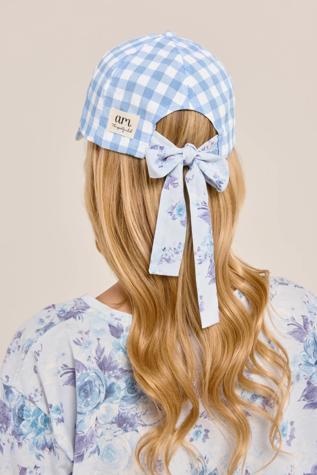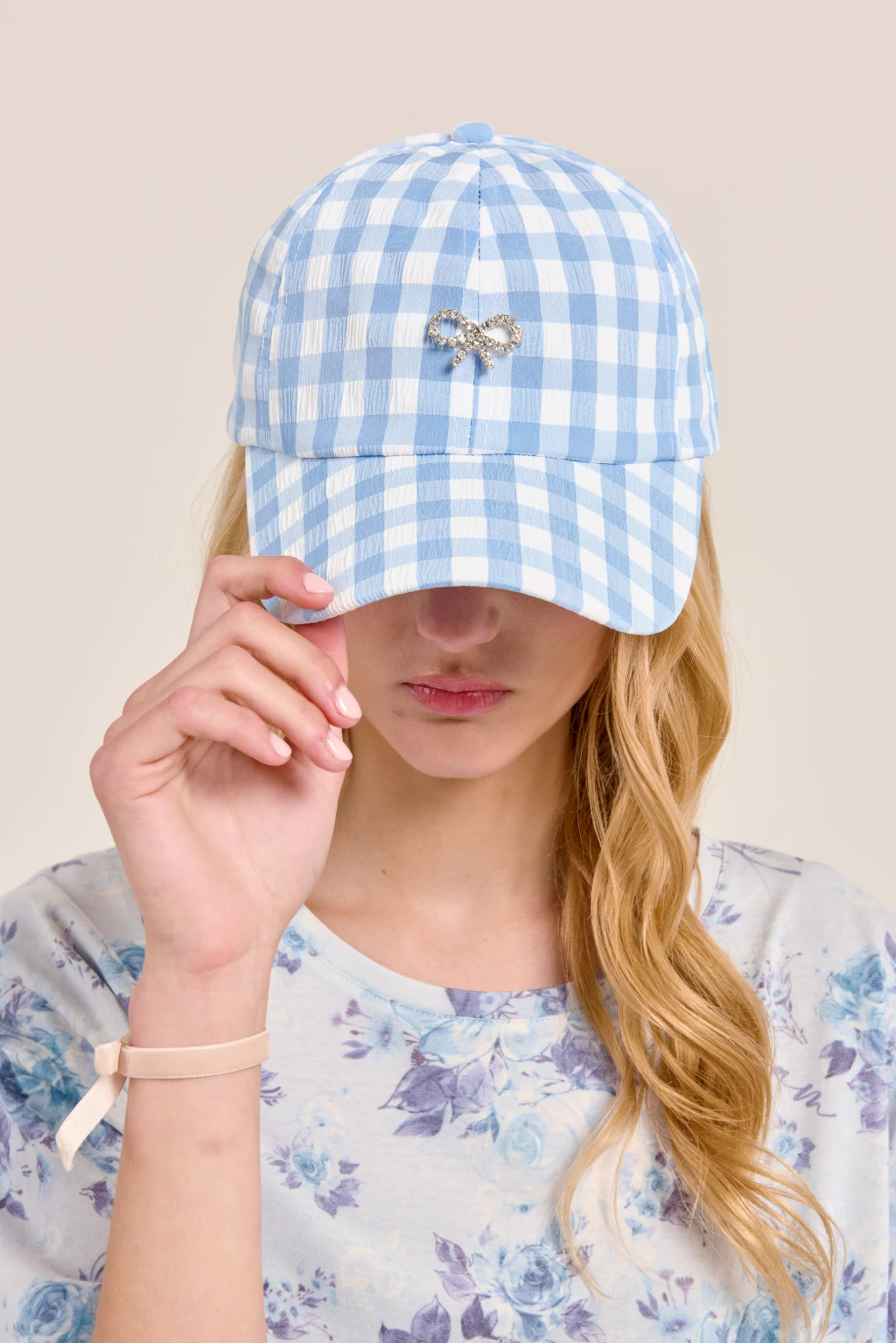 Gorra de vichy regulable con lazos de sedita estampada y aplique de moño con strass cristal. Detrás lleva a la vista una etiqueta de la cápsula.