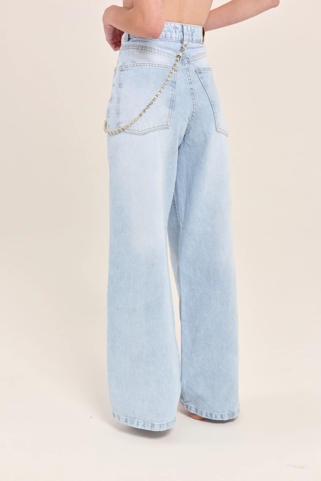 Jean wide leg tiro alto confeccionado en denim celeste. Fit que elastiza la figura. Viene con una cadena de strass extraíble súper canchera para que puedas agregárselo a cualquier jean de AM. Es ideal para dejar atrás los jeans de corte clásico y usar este jean con mucho estilo, pero sin perder la elegancia en cada detalle.