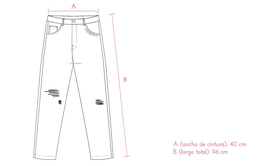 Jeans tipo mom de tiro alto confeccionado en denim de algodón gastado con roturas y aplique de piedras para crear un look bien canchero. Ancho en la parte superior y entallado en la botamanga. Fit que resalta y destaca la figura. Cierre en el centro y botón metálico. Es ideal para dejar atrás los jeans de corte clásico y usar este jean con mucho estilo, pero sin perder la elegancia en cada detalle.