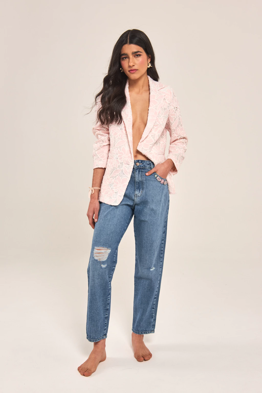 Jeans tipo mom de tiro alto confeccionado en denim de algodón gastado con roturas y aplique de piedras para crear un look bien canchero. Ancho en la parte superior y entallado en la botamanga. Fit que resalta y destaca la figura. Cierre en el centro y botón metálico. Es ideal para dejar atrás los jeans de corte clásico y usar este jean con mucho estilo, pero sin perder la elegancia en cada detalle.