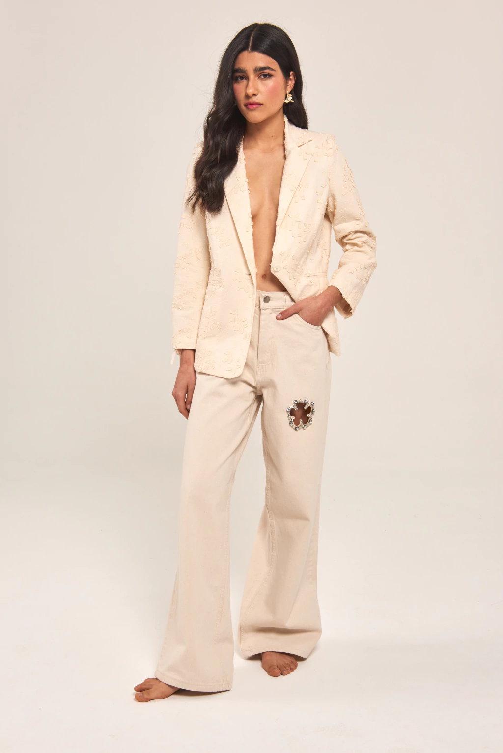 Jean wide leg tiro alto confeccionado en denim de algodón. Tiene un fit amplio que aporta comodidad en su uso. Tiene un calado en forma de flor rodeado de strass bordados a mano que le da el toque romántico. Cierre y botón metálico. Lleva bolsillos delanteros y traseros. Ideal para levantar tus looks.