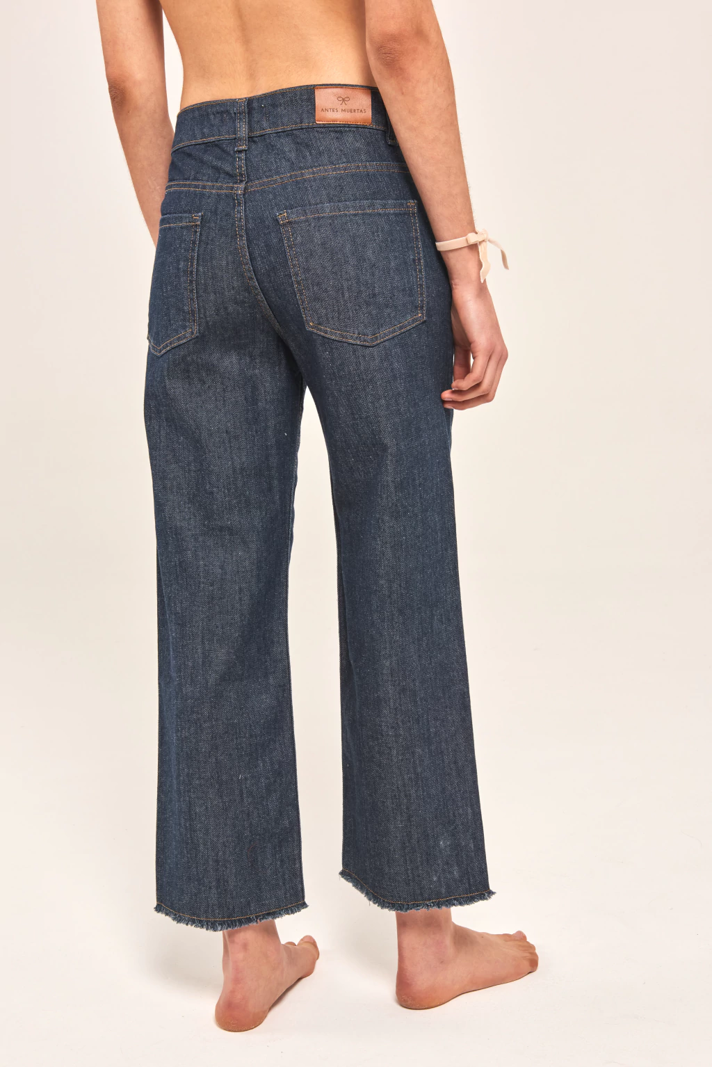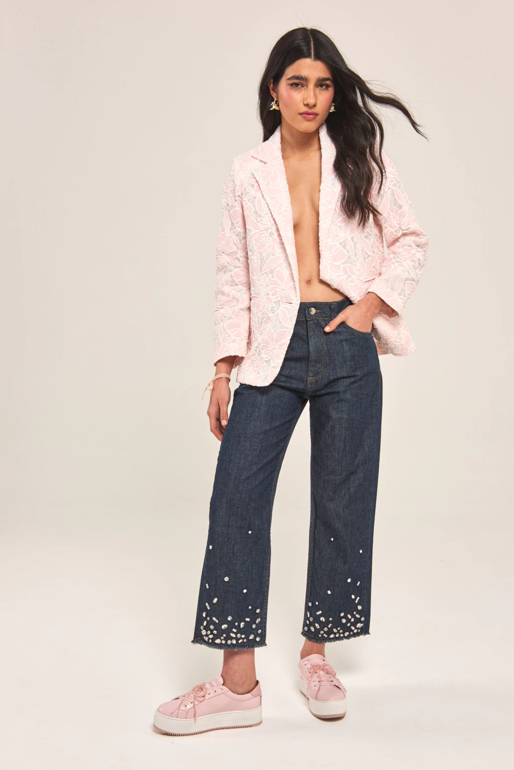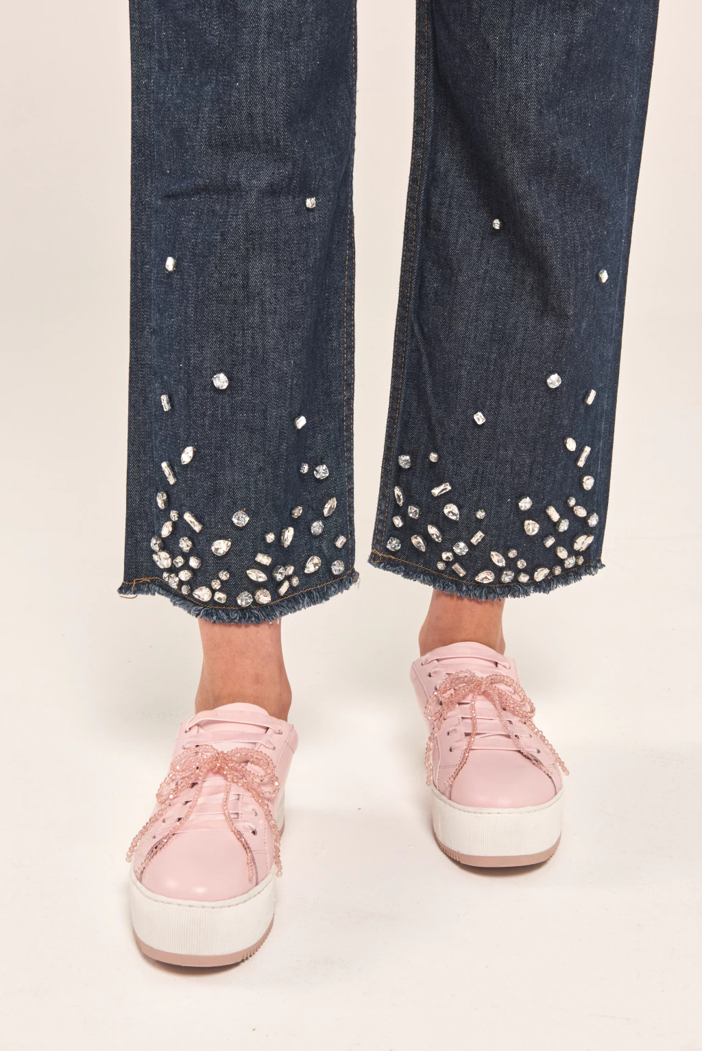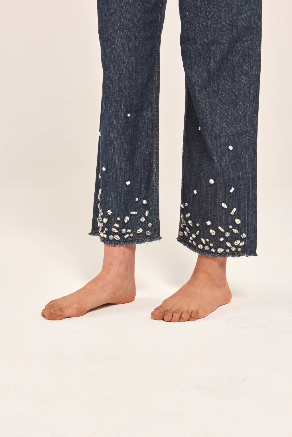 Jean recto tiro medio confeccionado en denim de algodón. Los ruedos están cubiertos de strass de distintos tamaños bordados a mano, que aportan brillo, originalidad y un toque súper canchero a tu look. Una prenda única e ideal para usar todos los días.