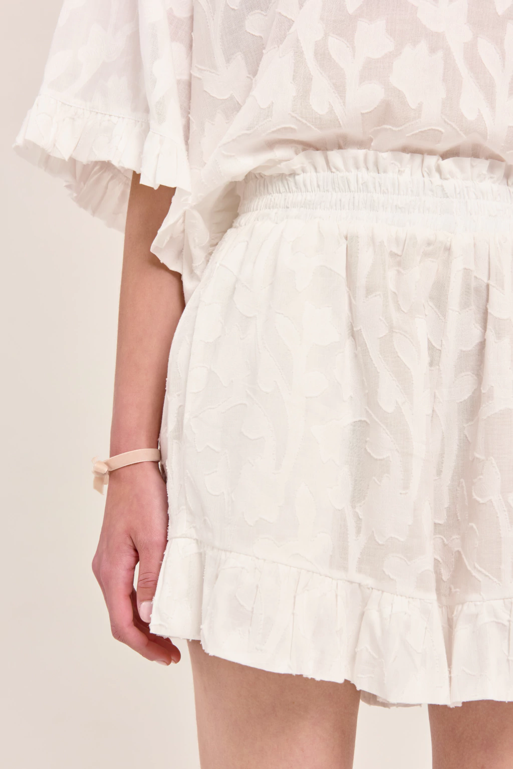 Short confeccionado en voile jacquard de algodón. De calce holgado y cómodo, cuenta con cintura elastizada para mejor ajuste y practicidad. Tiene bolsillos laterales y un volado en ruedo que le aporta un toque femenino y romántico. Podes completar tu look con la blusa Isa.