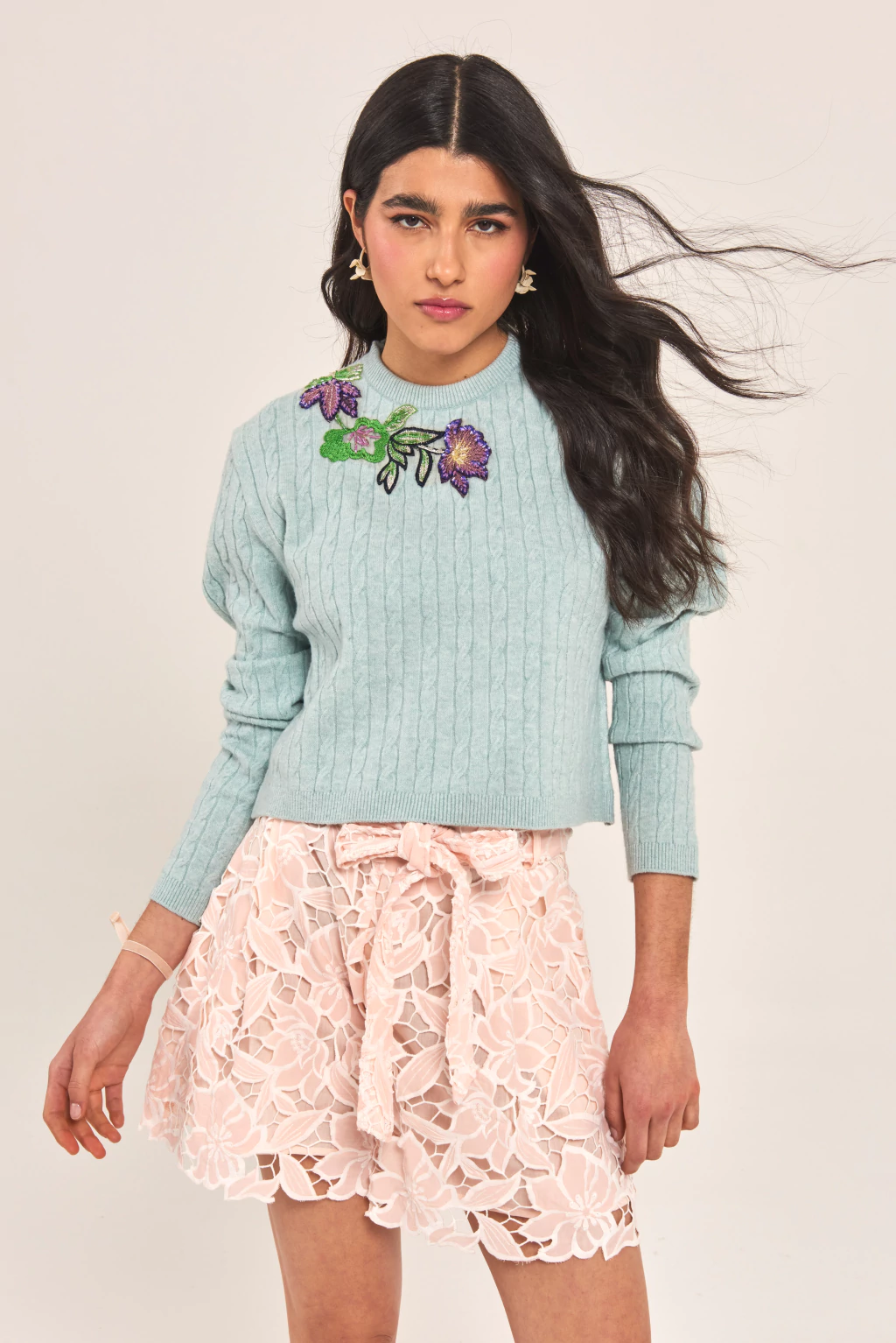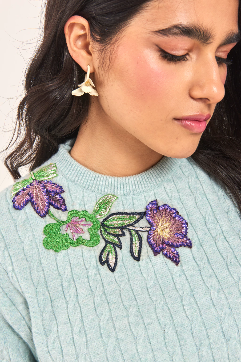 Sweater trenzado con cuello redondo, acompañado de un hermoso bordado floral que levanta cualquier look. Es una prenda única, para darle ese toque especial a tus looks. Ideal para una cita o salida con amigas.