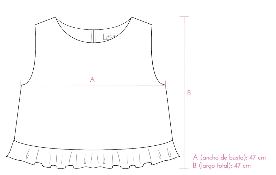 Top confeccionado en lino con motivo de flores. Escote redondo sin mangas. Abertura en espalda con botón a tono. Es una prenda romántica y femenina, que destaca tus looks con el cruce y volados que tiene en la espalda. Podes combinarlo con la falda Audrey.